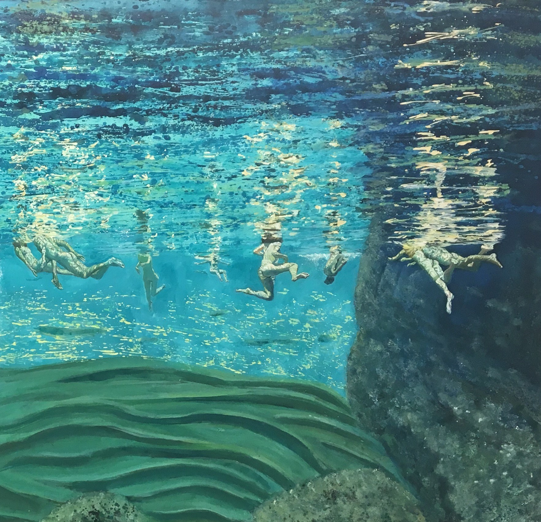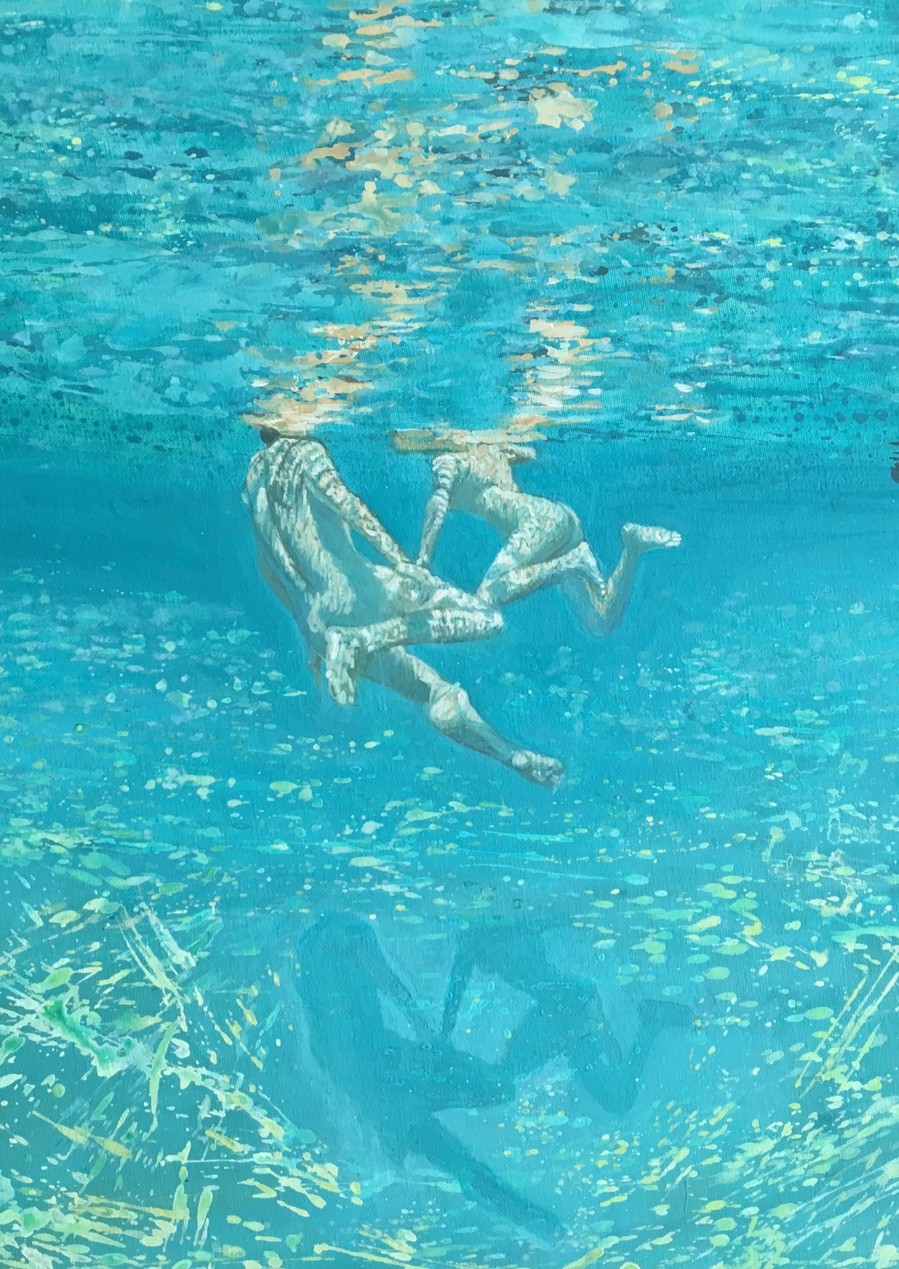 Οι επισκέπτες της γκαλερί Kapopoulos Fine Arts στην Πάτμο θα δουν υποβρύχιους κολυμβητές ανάμεσα σε αρχαία σπαράγματα, αλλά και στην απεραντοσύνη του βυθού, θάλασσες που στραφταλίζουν κάτω από τον δυνατό ήλιο, λουόμενους σε καταρράκτες σε παραλίες, πάνω στην ζεστή άμμο.