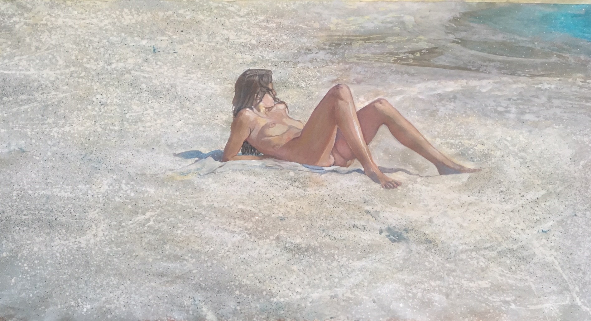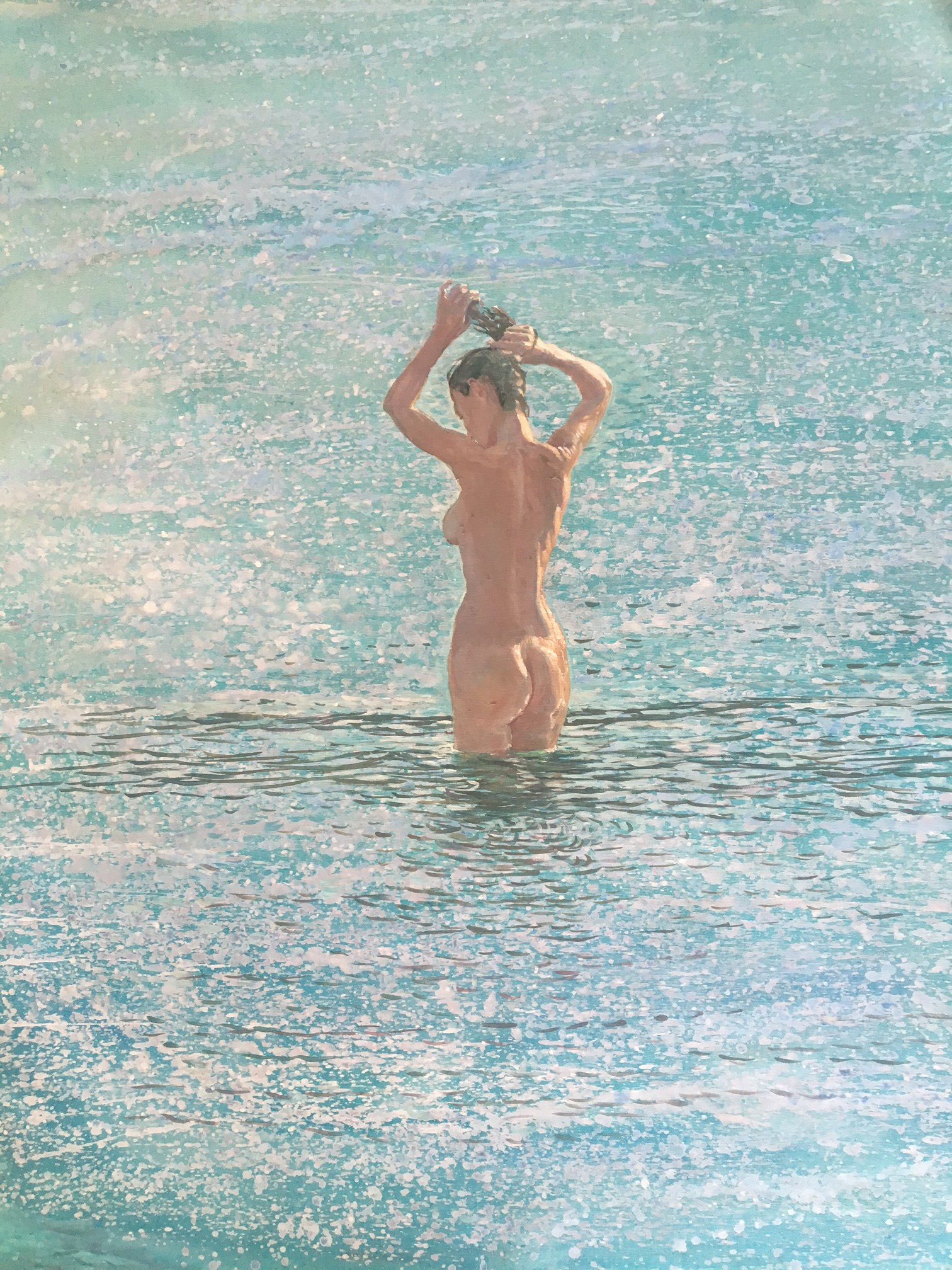 Ζωγραφίζω βιωμένους προσωπικούς παραδείσους, την ευτυχία, τη χαλάρωση, την ένωση με την φύση, τον ερωτισμό που νιώθουν οι λουόμενοι μέσα στο νερό. Νομίζω ότι όλη η ύπαρξη είναι μια λεπτή ισορροπία της επίγνωσης ότι οι ευτυχισμένες στιγμές είναι πολύτιμες και πρέπει να τις αναγνωρίζουμε και να τις εκτιμάμε. Ζωγραφίζω λοιπόν τα σύνορα της ευτυχίας, απομονωμένης από το πριν και το μετά. Δεν υπάρχει χρόνος, μόνο τόπος. Επικεντρώνομαι στον άχρονο καθαρό χώρο που είναι ο ήρεμος προσωπικός χώρος.