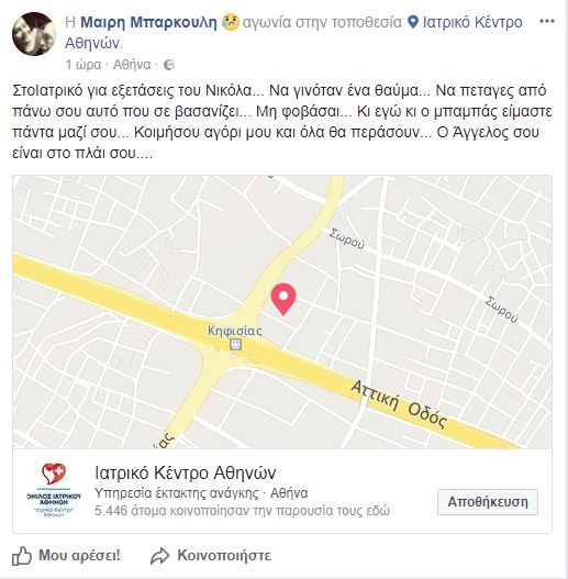 Στο νοσοκομείο βρίσκεται, ο 16χρονος γιος του αείμνηστου ηθοποιού, Ανδρέα Μπάρκουλη, Νικόλας.