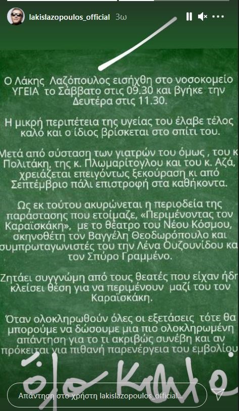 Δείτε την ανακοίνωση στον επίσημο λογαριασμό του Λάκη Λαζόπουλου στο Instagram: