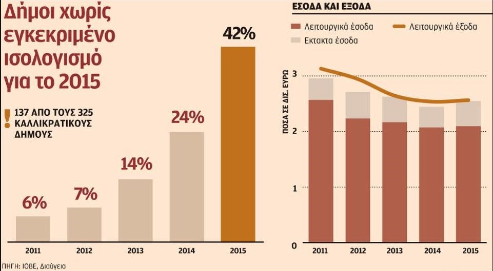 Η λογιστική του δεδουλευμένου έγινε υποχρεωτική για όλους τους καλλικρατικούς δήμους, όπως προέκυψαν από τον νόμο του 2010, αλλά όπως καταγράφεται στη σχετική μελέτη, το ποσοστό των δήμων χωρίς εγκεκριμένους προϋπολογισμούς έχει εκτιναχθεί από το 6% το 2011, στο 14% το 2013 και στο 42% το 2015.