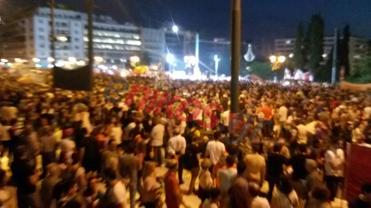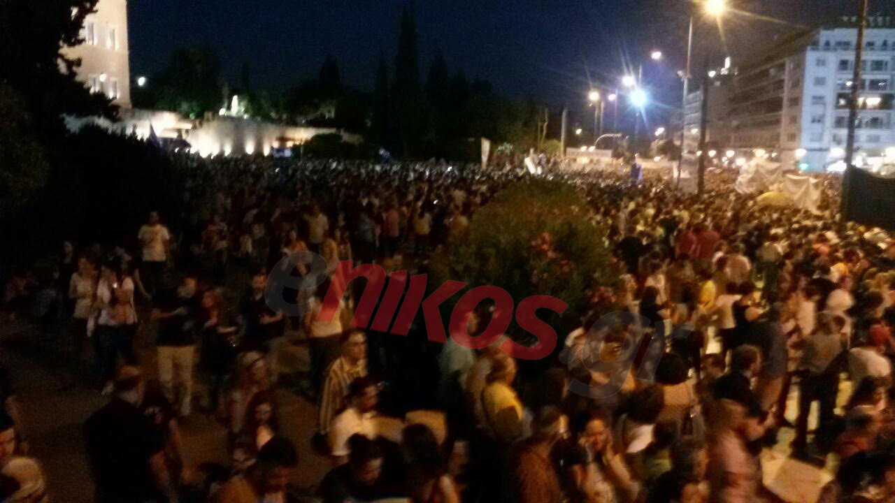 Στο Σύνταγμα παραμένουν οι διαδηλωτές, φωνάζοντας υπέρ του “όχι” στο δημοψήφισμα της Κυριακής.