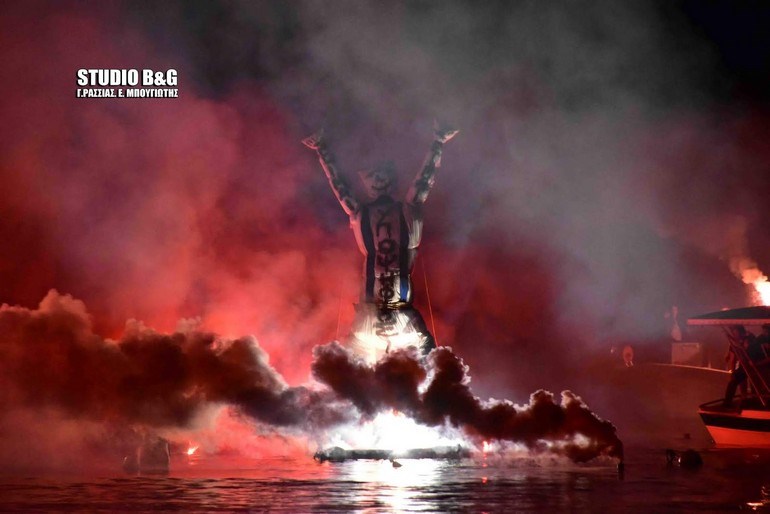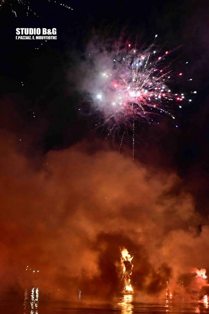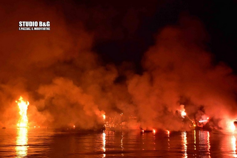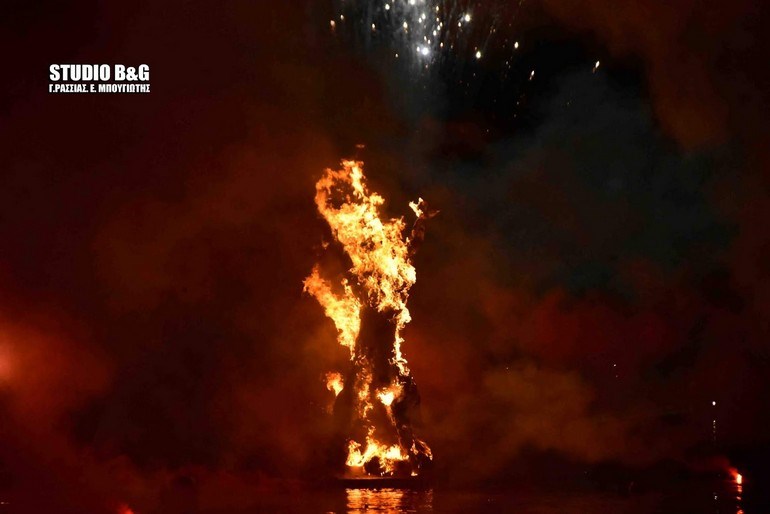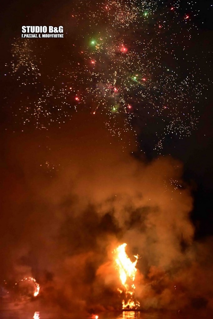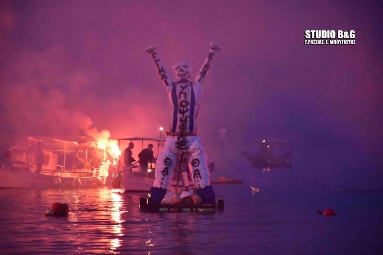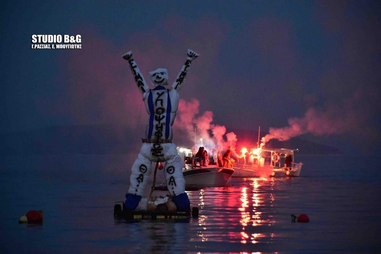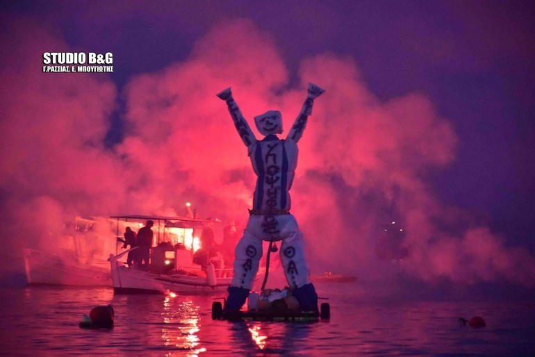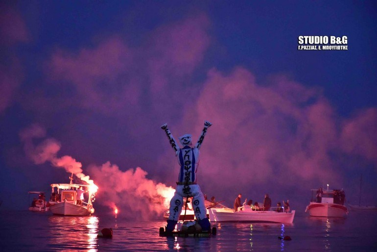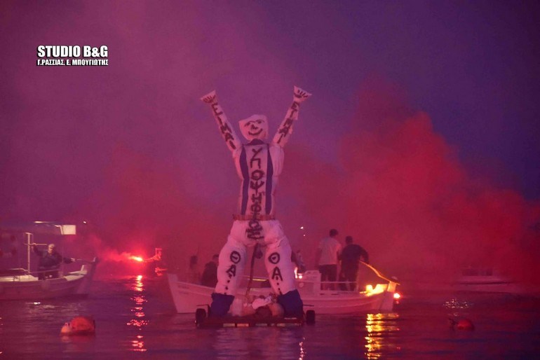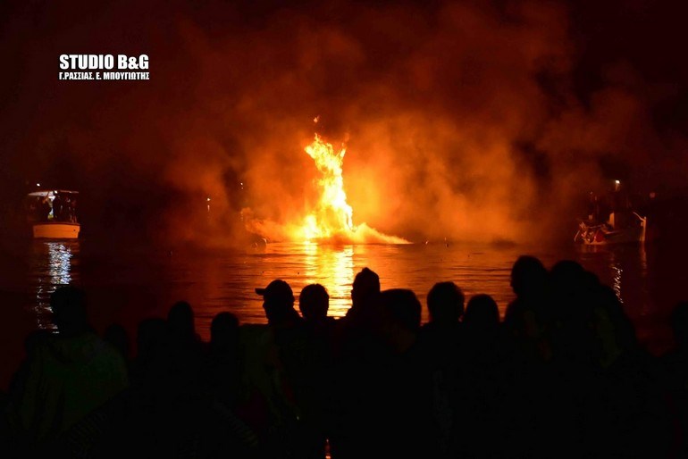 Το ομοίωμα του Ιούδα είχε τοποθετηθεί σε ειδική εξέδρα μέσα στην θάλασσα και βάρκες με βεγγαλικά ξεκίνησαν από το λιμάνι του Τολού και πυρπόλησαν τον στόχο τους.