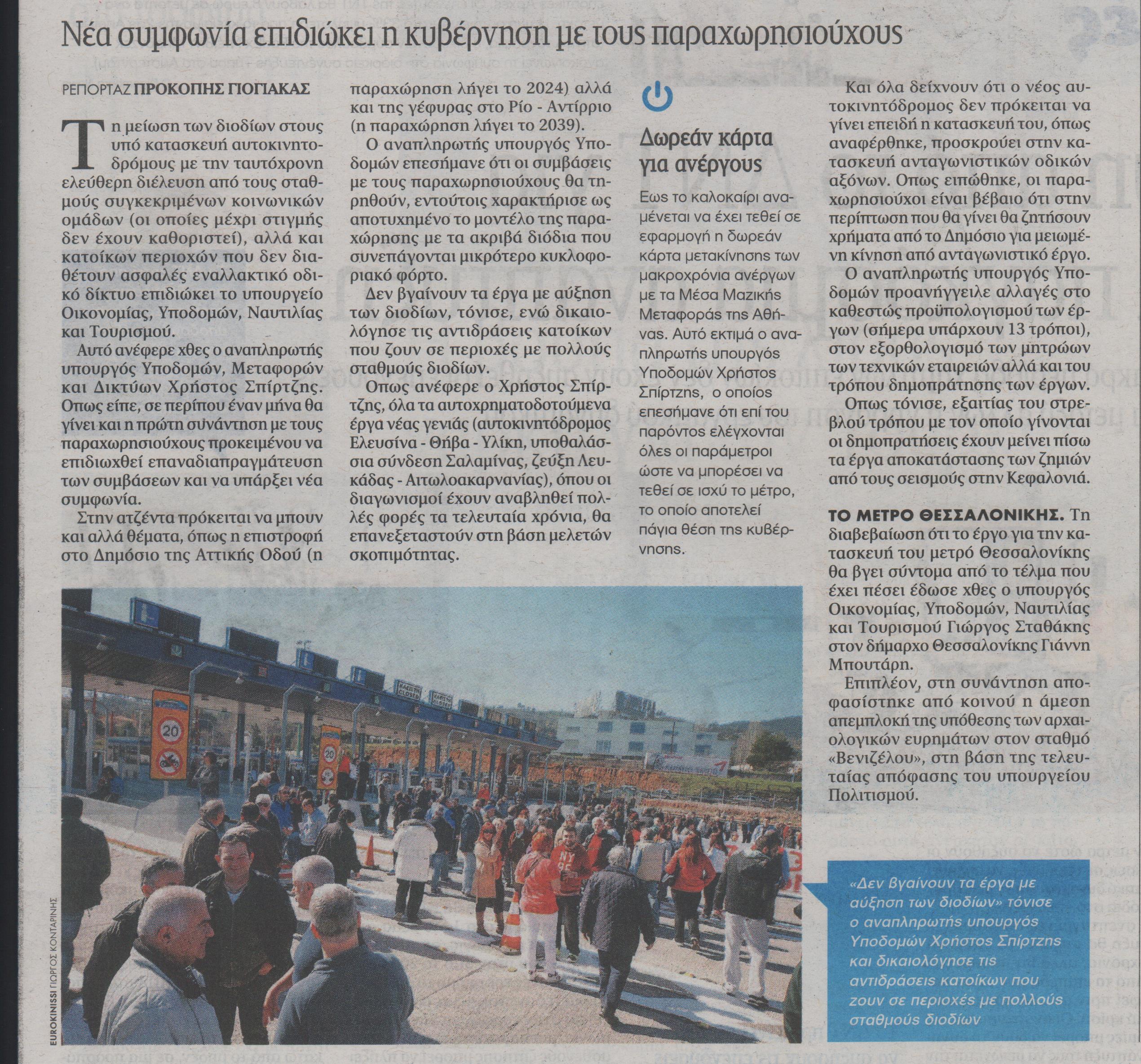 Αυτό ανέφερε χθες ο αναπληρωτής υπουργός Υποδομών, Μεταφορών και Δικτύων Χρήστος Σπίρτζης. Όπως είπε, σε περίπου ένα μήνα θα γίνει και η πρώτη συνάντηση με τους παραχωρησιούχους προκειμένου να επιδιωχθεί επαναδιαπραγμάτευση των συμβάσεων και να υπάρξει νεά συμφωνία.
