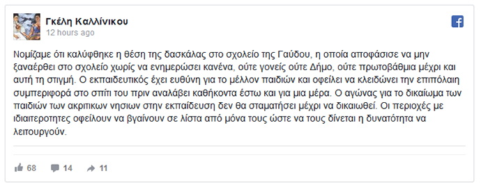 Όμως όπως δήλωσε στο flashnews.gr η κ. Καλλίνικου, σε επικοινωνία που είχε με τη δασκάλα, της δήλωσε πως τελικά δεν θα επιστρέψει Γαύδο γιατί μάλλον θα παραιτηθεί.