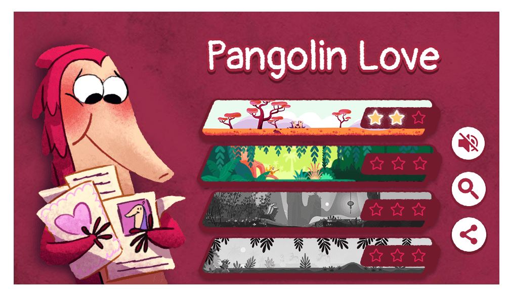 Πρόκειται για δύο παγκολίνους για τους οποίους το σημερινό Doodle δίνει πληροφορίες. Ο παγκολίνος είναι ένα θηλαστικό που ανήκει στη τάξη των φολιδωτών. Η μόνη οικογένεια που σώζεται μέχρι σήμερα, οι Μανίδες, έχει ένα γένος, το Μάνις, το οποίο αποτελείται από οχτώ είδη. Αυτά τα είδη έχουν διαστάσεις από 30 μέχρι 100 εκατοστά μήκος. Το όνομα παγκολίνος προέρχεται από τη μαλαισιανή γλώσσα «πενγκουλίν», που σημαίνει «κάτι που κυλάει». Βρίσκεται σε τροπικές περιοχές της Αφρικής και της Ασίας.