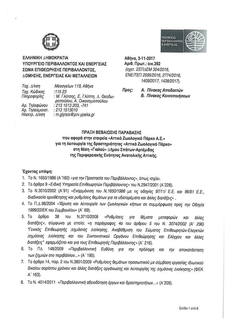 Στον εισαγγελέα παραπέμπουν οι επιθεωρητές Περιβάλλοντος, το Αττικό Ζωολογικό Πάρκο για τη διερεύνηση τυχόν αξιόποινων πράξεων, σχετικά με τις επιδείξεις με δελφίνια. Όπως αναφέρεται σε δημοσίευμα της “Καθημερινής”, το θέμα προέκυψε μετά από αναφορά του βουλευτή του ΣΥΡΙΖΑ Γιώργου Δημαρά, η οποία είχε ως αποτέλεσμα τη διενέργεια αυτοψίας στο πάρκο. «Στην έκθεση αυτοψίας οι Επιθεωρητές περιγράφουν 20λεπτη ψυχαγωγική παράσταση με δελφίνια, για την οποία κατέβαλλαν αντίτιμο 3 ευρώ πλέον του εισιτηρίου. Όπως επισημαίνουν, οι παραστάσεις με τη συμμετοχή ζώων απαγορεύονται ρητά τόσο από τη νομοθεσία (η οποία εξαιρεί μόνο τις παραστάσεις ιππικής δεξιοτεχνίας και διεξαγωγής αθλημάτων ιππασίας), όσο και από την απόφαση έγκρισης περιβαλλοντικών όρων του ζωολογικού κήπου. Επίσης οι Επιθεωρητές διαπίστωσαν ότι η άδεια λειτουργίας του Αττικού Ζωολογικού Πάρκου είχε λήξει από το Μάρτιο του 2013. Η άδεια ανανεώθηκε μετά τον έλεγχο, τον Ιούλιο του 2017, επομένως το Πάρκο “λειτουργούσε χωρίς την προβλεπόμενη άδεια για χρονικό διάστημα μεγαλύτερο των τεσσάρων ετών”» αναφέρεται στο ρεπορτάζ της «Καθημερινής».Η θέση της εταιρείας είναι ότι δεν πρόκειται για παράσταση αλλά για εκπαιδευτική παρουσίαση, επισημαίνοντας πως έχει αθωωθεί δικαστικά δύο φορές για το ίδιο ζήτημα.