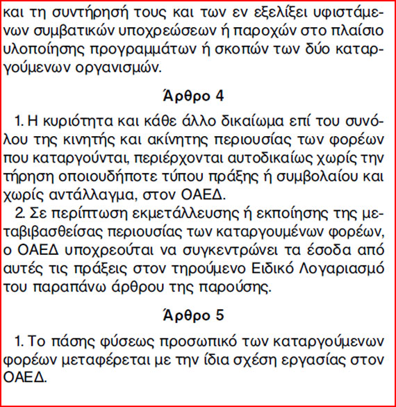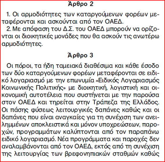 Στον ΟΑΕΔ μεταφέρονται οι αρμοδιότητες και το προσωπικό των Οργανισμών Εργατικής Κατοικίας και Εργατικής Εστίας, σύμφωνα με το Φύλλο της Εφημερίδας της Κυβερνήσεως της 29ης Φεβρουαρίου.Τα ταμειακά διαθέσιμα όπως και τα έσοδα θα μεταφερθούν σε νέο ειδικό λογαριασμό, από τον οποίο θα καλύπτονται οι λειτουργικές ανάγκες και υποχρεώσεις των οργανισμών.