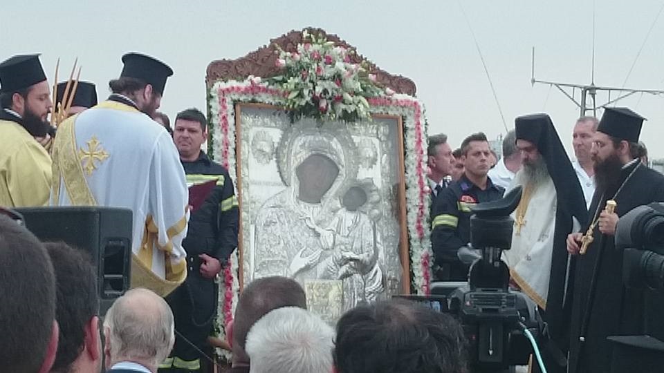 Σύντομη δέηση τελέστηκε σε ειδικά διαμορφωμένη εξέδρα εντός του λιμανιού και στη συνέχεια η Ιερή εικόνα τοποθετήθηκε σε όχημα της πυροσβεστικής.