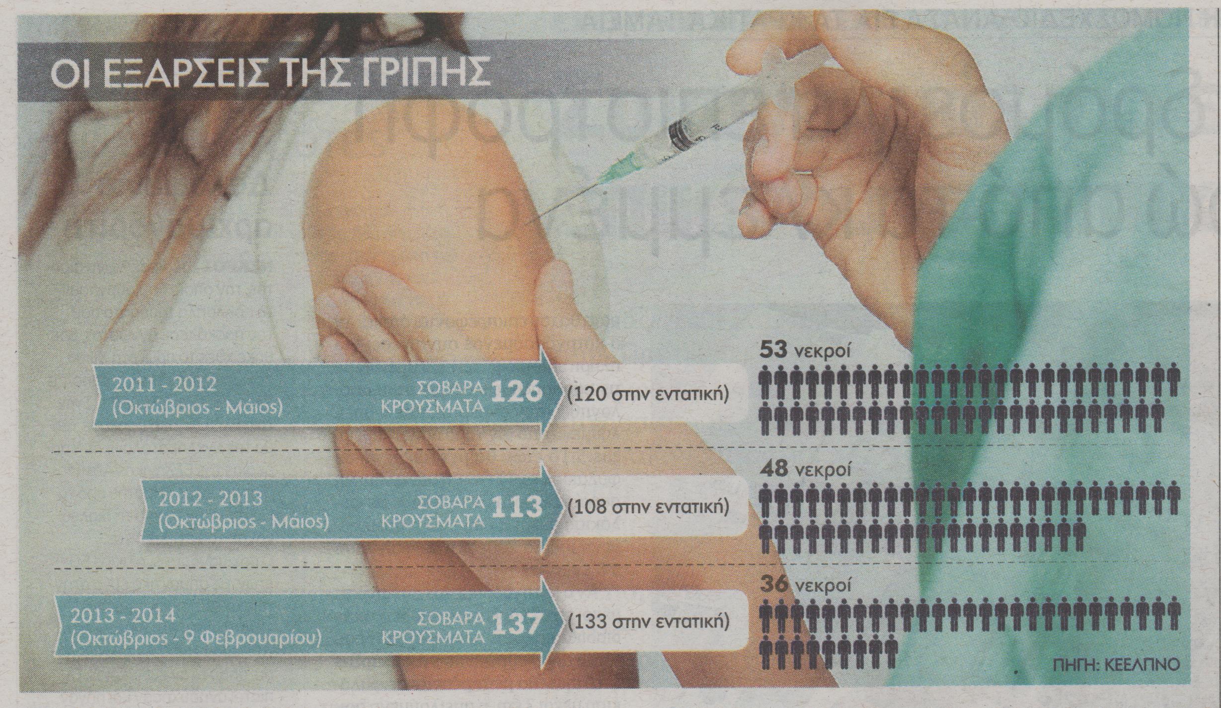 Οι επιδημιολόγοι του Κέντρου Ελέγχου και Πρόληψης Νοσημάτων (ΚΕΕΛΠΝΟ) σημειώνουν ότι η γρίπη βρίσκεται στην κορύφωσή της. Μία στις 16 επισκέψεις Ελλήνων σε γιατρό αφορούν «γριπώδη συνδρομή», η οποία περιλαμβάνει συμπτώματα όπως βήχας, πυρετός πάνω από 38, πόνο στους μυς ή και πονοκέφαλο.