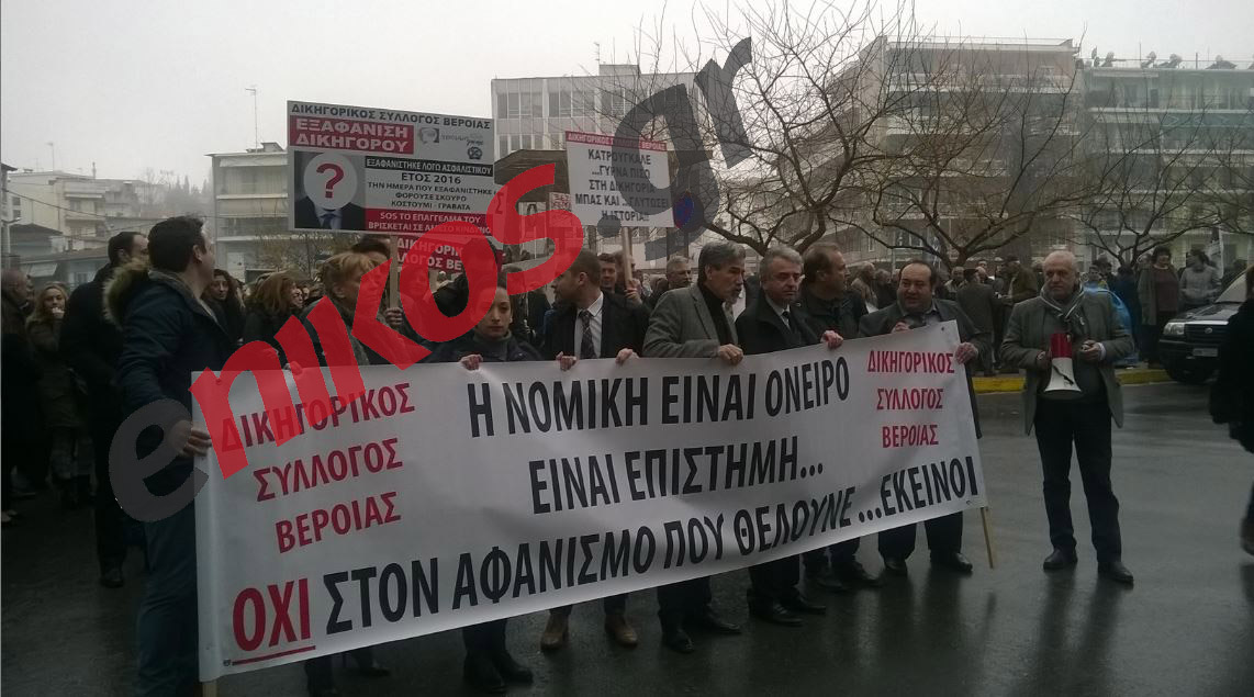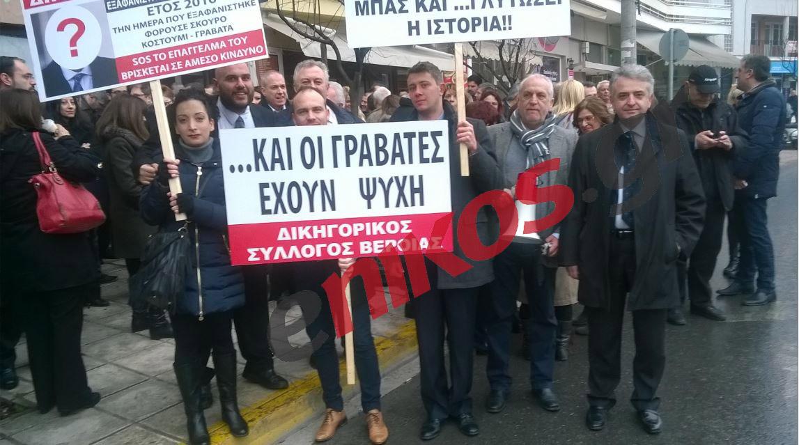 Στις απεργιακές κινητοποιήσεις συμμετέχουν οι δικηγόροι της Βέροιας αντιδρώντας στο ασφαλιστικό που προωθεί η κυβέρνηση. Οι δικηγόροι κατευθύνονται προς το δημαρχείο της πόλης, ενώ όπως φαίνεται και στη φωτογραφία σε ένα πανό γράφουν: «Και οι γραβάτες έχουν ψυχή».