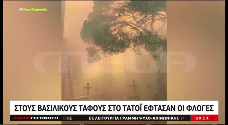 Συναγερμός σήμανε στο κτήμα Τατοΐου καθώς η φωτιά “εισέβαλε” στο εσωτερικό του. Όπως φαίνεται στο βίντεο που μετέδωσε το MEGA, οι φλόγες έφτασαν στους βασιλικούς τάφους και έκαψαν τη βλάστηση που υπήρχε γύρω από αυτούς και τον περιβάλλοντα χώρο. Η πυρκαγιά ωστόσο άφησε ανέπαφη την εκκλησία αλλά και το μαυσωλείο. Στο σημείο βρέθηκαν από την πρώτη στιγμή ισχυρές επίγειες δυνάμεις της Πυροσβεστικής που έδωσαν μάχη για να μην περάσει η φωτιά στα κύρια κτίσματα με τα ιερά κειμήλια.