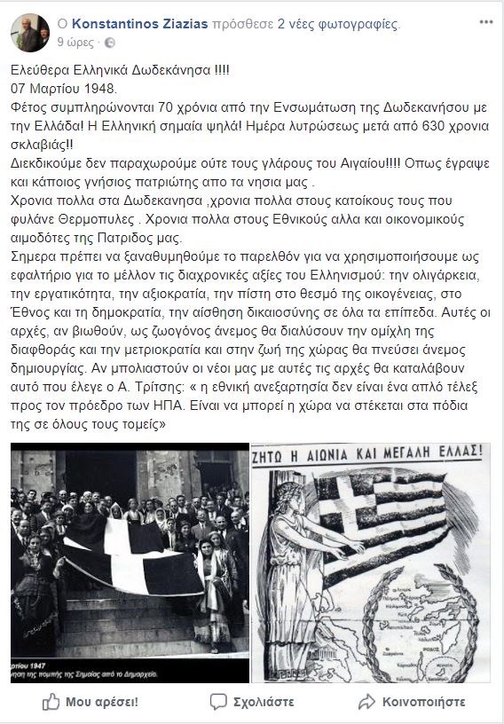 “Δεν παραχωρούμε ούτε τους γλάρους του Αιγαίου” ανέφερε μεταξύ άλλων σε ανάρτηση του στο facebook ο επίτιμος Αρχηγος ΓΕΣ, Κωνσταντίνος Ζιαζιάς με αφορμή την συμπλήρωση των 70 χρόνων από την ενσωμάτωση της Δωδεκανήσου με την Ελλάδα.