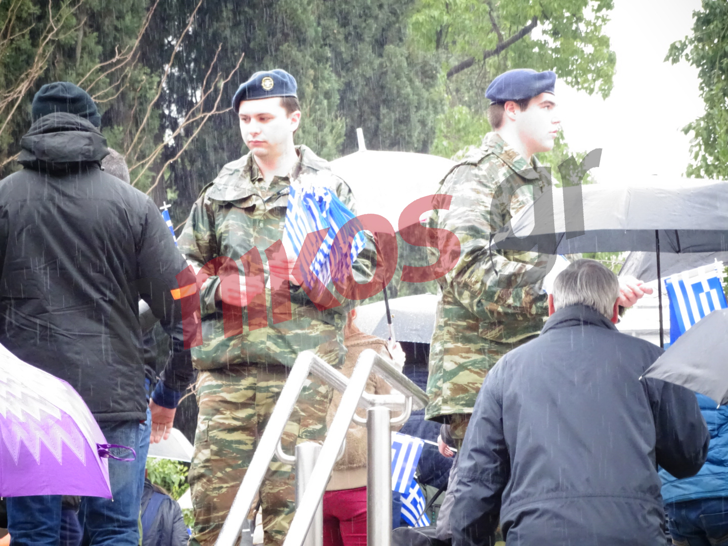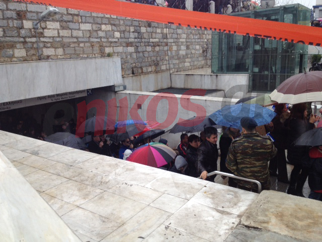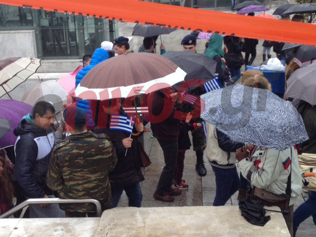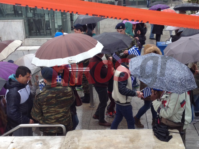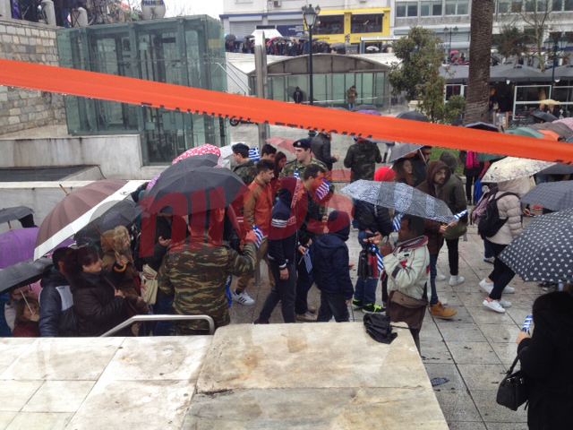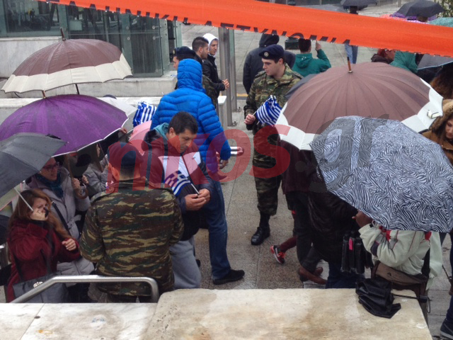 Έξω από τον σταθμό του μετρό στο Σύνταγμα, στρατιώτες μοιράζουν σημαιάκια σε όσους θα παρακολουθήσουν την παρέλαση κάτω από έντονη βροχόπτωση.