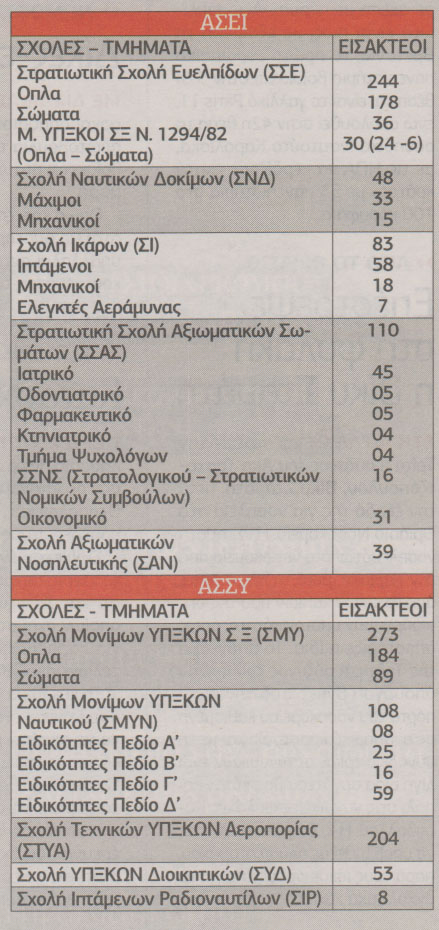 Τον αριθμό των εισακτέων στα Ανώτατα Στρατιωτικά Εκπαιδευτικά Ιδρύματα και τις Ανώτερες Στρατιωτικές Σχολές Υπαξιωματικών για το νέο ακαδημαϊκό έτος καθόρισαν με κοινή τους απόφαση οι αρμόδιοι υπουργοί.Ετσι, στις στρατιωτικές σχολές ο αριθμός των εισακτέων για το έτος 2012-13 θα αγγίξει τους 1.170. ΔΕΙΤΕ ΤΟΝ ΠΙΝΑΚΑ