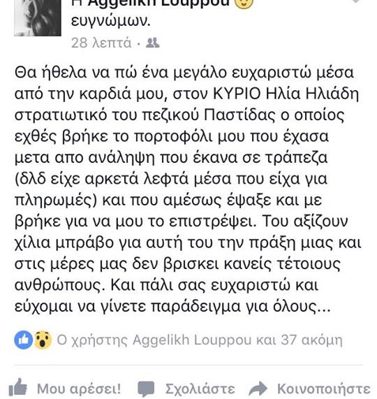Ένας αξιωματικός του Πεζικού, που υπηρετεί στη Ρόδο, βρήκε ένα πορτοφόλι γεμάτο χρήματα και μετά από προσωπικές του ενέργειες εντόπισε την κάτοχό του και το παρέδωσε. Πρόκειται για τον Ηλία Ηλιάδη, τον οποίο ευχαρίστησε δημόσια με ανάρτησή της στο Facebook, η κοπέλα που το είχε χάσει.