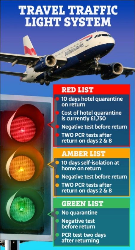 Όπως φαίνεται στο παραπάνω γράφημα, η “πράσινηλίστα” σημαίνει ότι όσοι επιστρέφουν δεν μπαίνουν σε καραντίνα, θα έχουν αρνητικό τεστ πριν από την επιστροφή και PCR που έχει γίνει πριν από δύο ημέρες. Στην “κόκκινη ζώνη” μπαίνουν σε 10ήμερη καραντίνα σε ξενοδοχείο μετά την επιστροφή, το κόστος της καραντίνας σε ξενοδοχείο είναι 1.750 στερλίνες, ενώ απαιτείται αρνητικό τεστ μετά την επιστροφή και δύο μοριακά τεστ αφού γυρίσουν τη δεύτερη και όγδοη ημέρα.