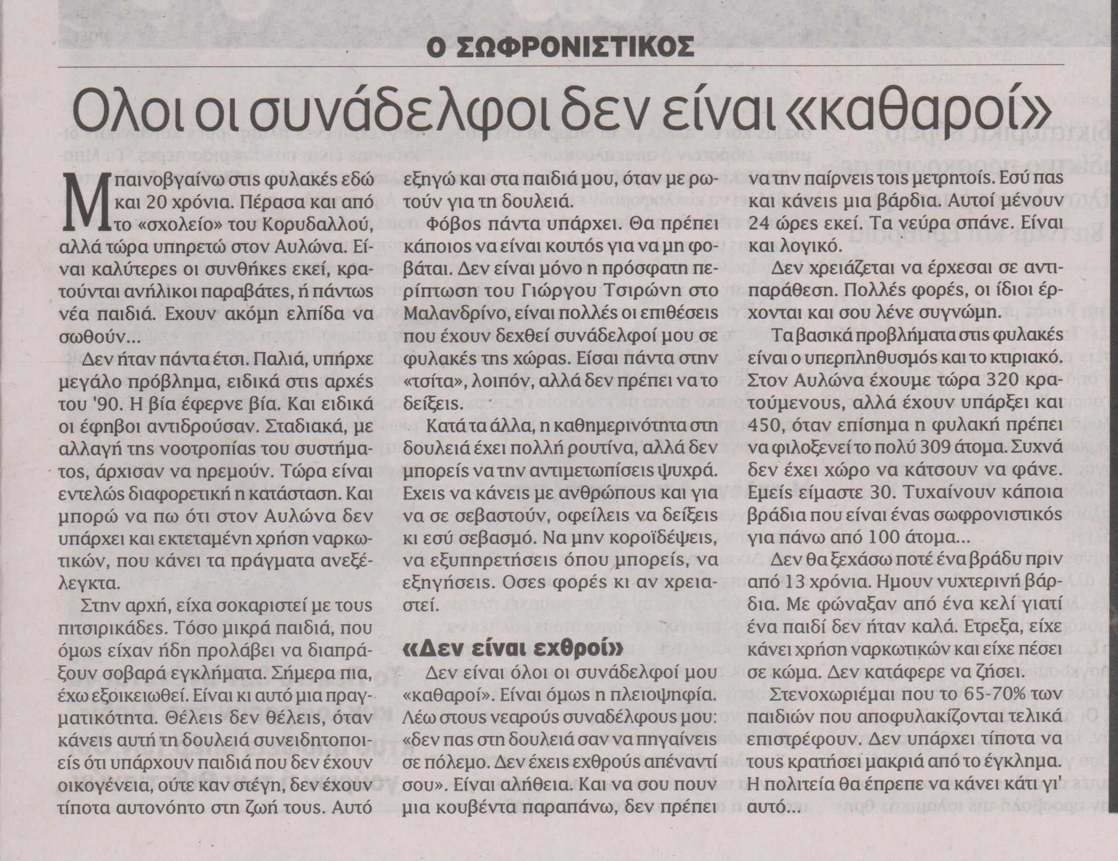 Λίγες ώρες μετά τη δολοφονία του υπαρχιφύλακα στο Μαλανδρίνο και το θάνατο βαρυποινίτη ένας σωφρονιστικός υπάλληλος και ένας κρατούμενος μιλούν στο «Έθνος» για τη συμβίωση τους μέσα στη φυλακή. Σε πρώτο πρόσωπο, διηγούνται τις εμπειρίες τους, αλλά και τη σχέση μεταξύ τους. Καθένας εκπροσωπεί μόνο τον εαυτό του, ωστόσο αποτελούν αντιπροσωπευτικό «δείγμα» των ανθρώπων που ζουν στο πετσί τους την κατάσταση στα σωφρονιστικά ιδρύματα της χώρας.