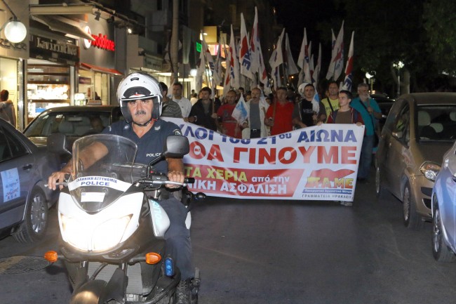 Στην πλατεία Ελευθερίας στο Ηράκλειο, τοπικοί φορείς, συνταξιούχοι εκπρόσωποι εργατικών και συνδικαλιστικών σωματείων με συνθήματα και πανό έκαναν πορεία στους κεντρικούς δρόμους.