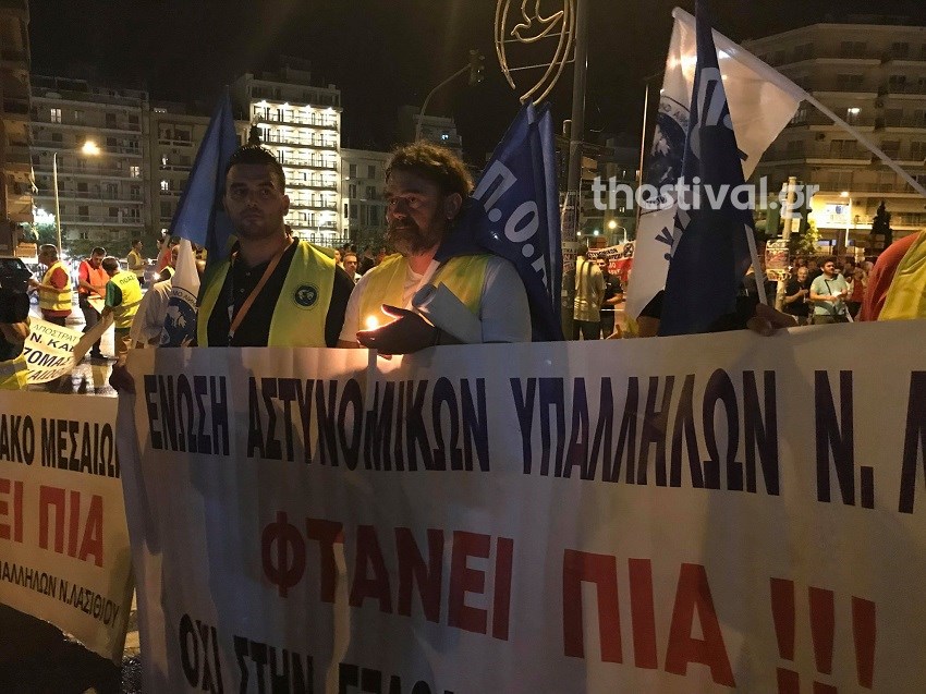 Συγκέντρωση και πορεία διαμαρτυρίας πραγματοποίησαν την Παρασκευή στο κέντρο της Θεσσαλονίκης, αστυνομικοί, πυροσβέστες, λιμενικοί και στρατιωτικοί, ενόψει των αυριανών εγκαινίων της 84ης ΔΕΘ.