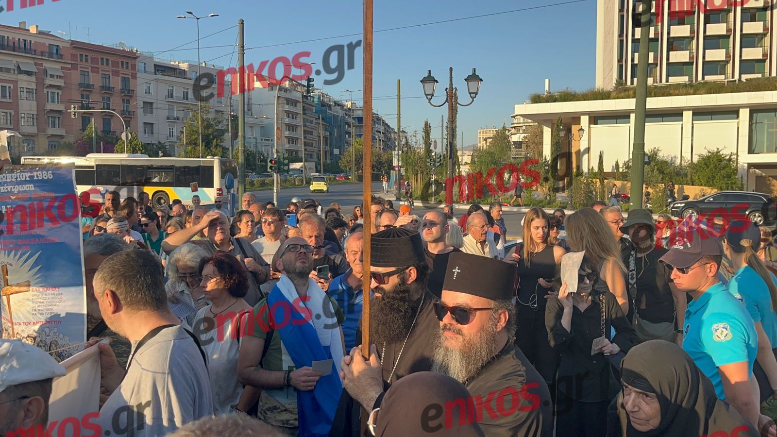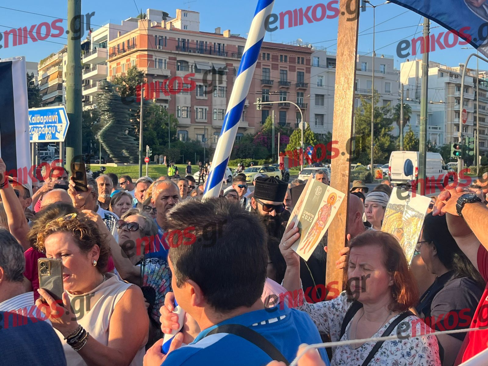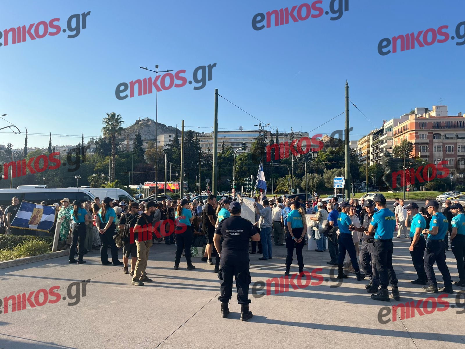 Συγκεκριμένα, όπως φαίνεται και στις παρακάτω φωτογραφίες, αρκετός κόσμος συγκεντρώθηκε έξω από την Εθνική Πινακοθήκη, κρατώντας στα χέρια εικόνες του Χριστού και της Παναγίας.