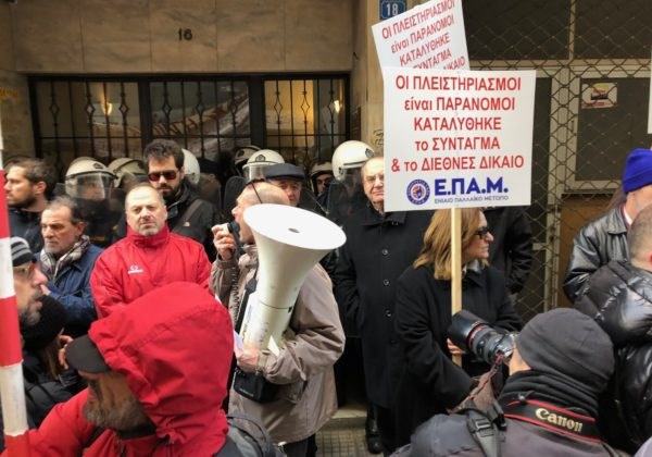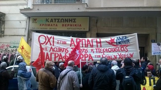 «Σήμερα κάτω και στα γύρω τετράγωνα από το συμβολαιογραφικό γραφείο στο κέντρο της Αθήνας, στο οποίο πήγαμε να διαμαρτυρηθούμε, ήταν παρατεταγμένες αναρίθμητες διμοιρίες ΜΑΤ για να αντιμετωπίσουν τον ειρηνικό «εσωτερικό εχθρό» και να μεθοδεύσουν την υλοποίηση ενός παράνομου και αδιαφανούς πλειστηριασμού. Είναι τραγικό ότι η συμβολαιογράφος, υπό την προστασία των ΜΑΤ, αρνήθηκε να δει μια επιτροπή που ήθελε να ζητήσει διευκρινίσεις και να καταθέσει τις αντιρρήσεις της». Δείτε τις φωτογραφίες: