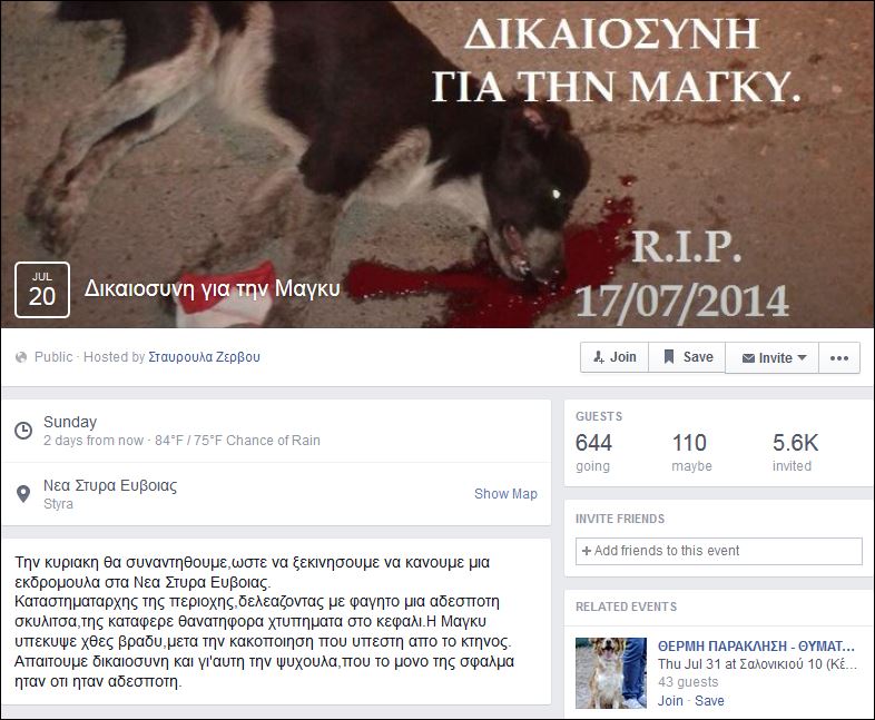 Μεγάλη είναι η κινητοποίηση στα μέσα κοινωνικής δικτύωσης από φιλοζωικές οργανώσεις και απλούς πολίτες που διοργανώνουν συγκέντρωση διαμαρτυρίας για τον θάνατο της αδέσποτης σκυλίτσας από το χτύπημα του ιδιοκτήτη ταβέρνας στα Νέα Στύρα. Στο Facebook έχει δημιουργηθεί σελίδα για όσους ενδιαφέρονται να δώσουν το παρών στα Νέα Στύρα το απόγευμα της Κυριακής ενώ οι προσκλήσεις ξεπερνούν τις 5.000 με παραπάνω από 600 άτομα να έχουν ήδη δηλώσει συμμετοχή στην διαμαρτυρία.