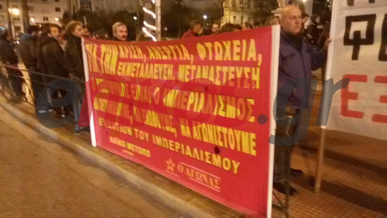 Σε εξέλιξη βρίσκεται συγκέντρωση διαμαρτυρίας στα Προπύλαια κατά της επίσκεψης του Αμερικανού υπουργού Εξωτερικών Τζον Κέρι στην Αθήνα. Στο σημείο βρίσκονται πολίτες με σημαίες της Λαϊκής Ενότητας, ενώ πανό κρατούν μέλη του Λαϊκού Μετώπου.