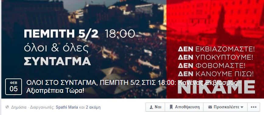 Κατεβαίνουμε στο Σύνταγμα και τις άλλες πλατείες της χώρας την Πέμπτη 5/2 στις 18.00 και όσες άλλες μέρες χρειαστεί, για να στείλουμε το μήνυμα σε όσους νομίζουν ότι μας έχουν στο χέρι, ότι κάτι δεν έχουν καταλάβει καλά. Η εποχή του γονατισμένης Ελλάδας και των υπάκουων κυβερνήσεων, τελείωσε. Στηρίζουμε την αμετακίνητη στάση της κυβέρνησης μας. Στέλνουμε την αλληλεγγύη μας σε όλους τους λαούς της Ευρώπης που περιμένουν από την Ελλάδα να στείλει το μήνυμα της αξιοπρέπειας και του τερματισμού της λιτότητας!».