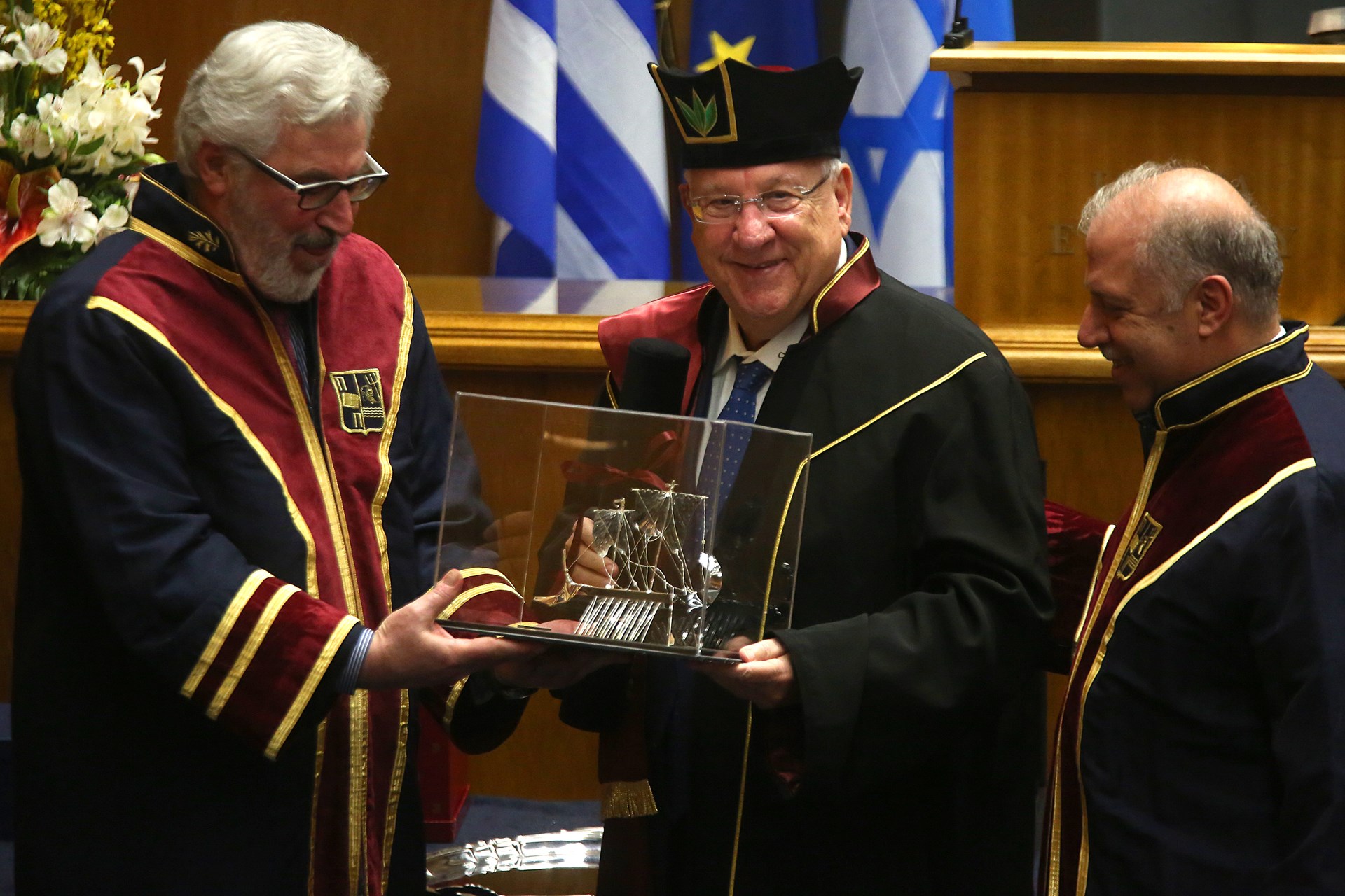 Συγκέντρωση διαμαρτυρίας πραγματοποίησαν μέλη της Λαϊκής Ενότητας, την ώρα που σε εκδήλωση στο «Ευγενίδειο Ίδρυμα» ο Πρόεδρος του Ισραήλ, Ρούβεν Ρίβλιν, ανακηρυσσόταν επίτιμος διδάκτορας του τμήματος Διεθνών και Ευρωπαϊκών σπουδών του Πανεπιστημίου Πειραιώς.