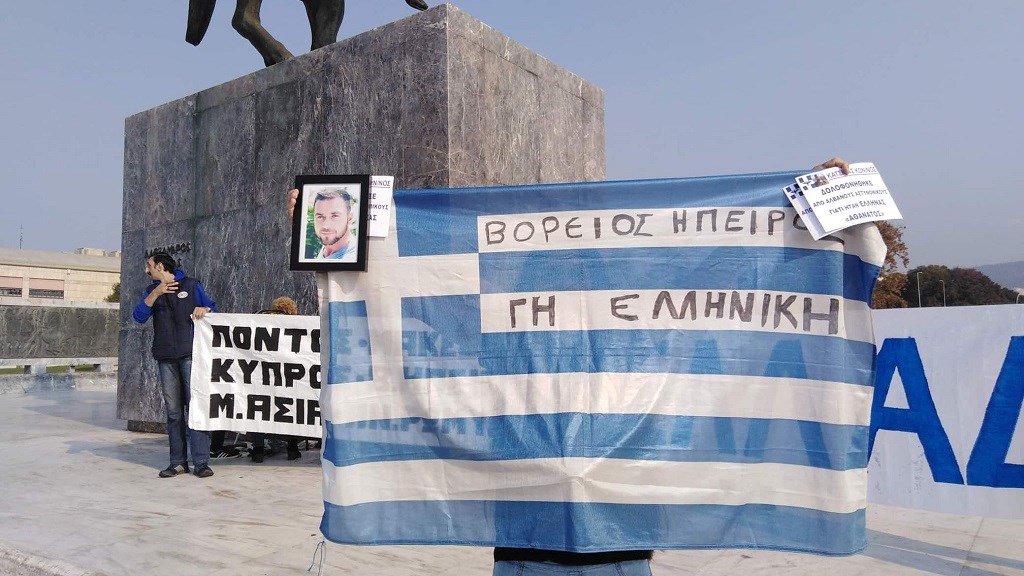 Πολίτες έχουν συγκεντρωθεί στο Άγαλμα του Μεγάλου Αλεξάνδρου, στην παραλία της Θεσσαλονίκης και με ελληνικές σημαίες στα χέρια, ψέλνουν τον εθνικό ύμνο και φωνάζουν συνθήματα.