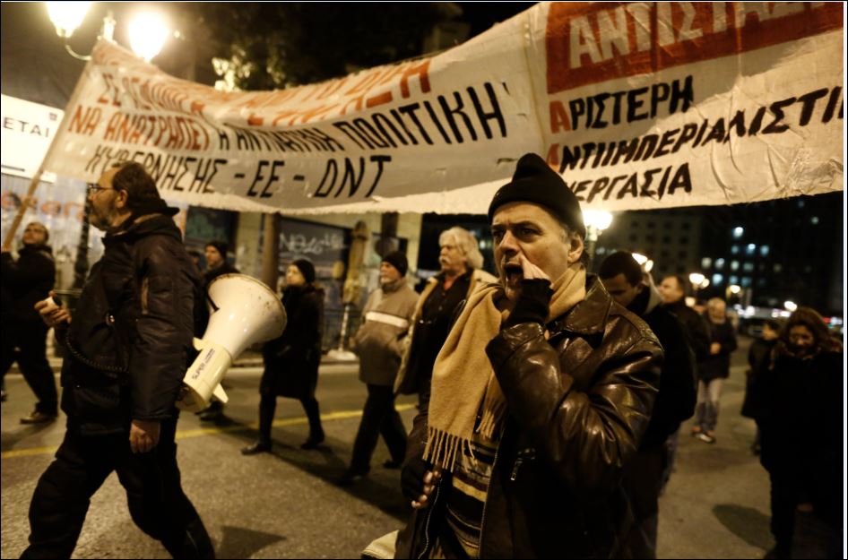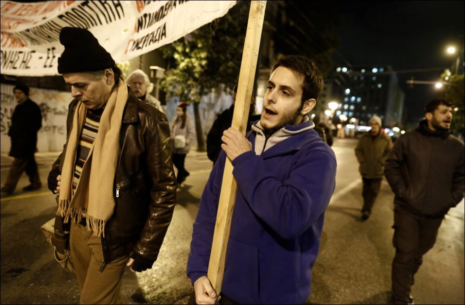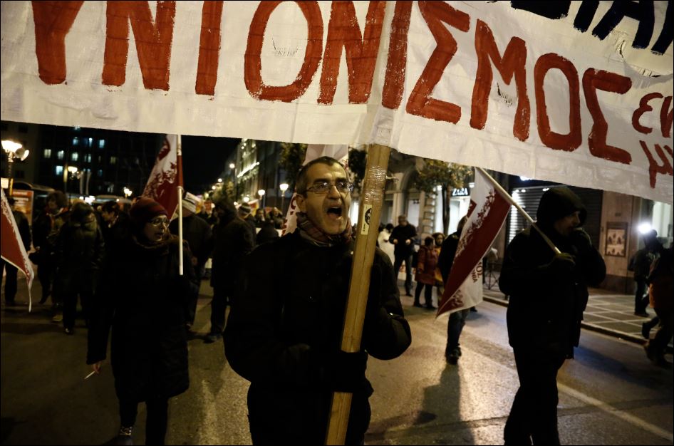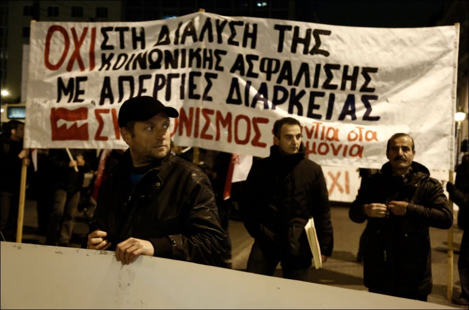 Διαδηλωτές κρατώντας πανό και φωνάζοντας συνθήματα παίρνουν μέρος στο συλλαλητήριο που οργάνωσε η Εκτελεστική Επιτροπή της Α.Δ.Ε.Δ.Υ., στην Πλατεία Κλαυθμώνος, και πορεία προς τη Βουλή, την ώρα που πραγματοποιείται η προ ημερήσιας διάταξης συζήτηση για το ασφαλιστικό.