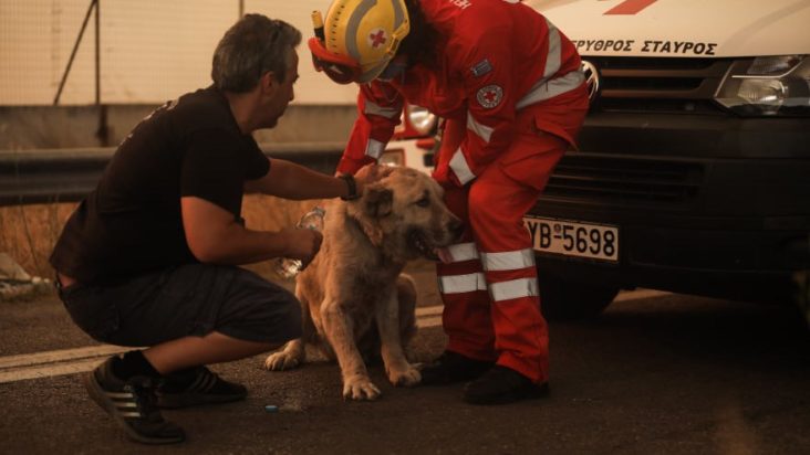 Όσοι συμμετέχουν στο έργο της κατάσβεσης, δεν ξεχνούν και τα τετράποδα, η ζωή των οποίων επίσης κινδυνεύει άμεσα από τις φλόγες και αναζητούν βοήθεια μέσα στην πύρινη κόλαση της φωτιάς. Οι εικόνες που κατέγραψε ο φωτογραφικός φακός είναι συγκλονιστικές. ΄Εθελοντές, πυροσβέστες και αστυνομικοί κατάφεραν να διασώσουν και να προσφέρουν βοήθεια σε έναν σκύλο, ο οποίος βρέθηκε τρομαγμένος και αβοήθητος ανάμεσα στις φλόγες.