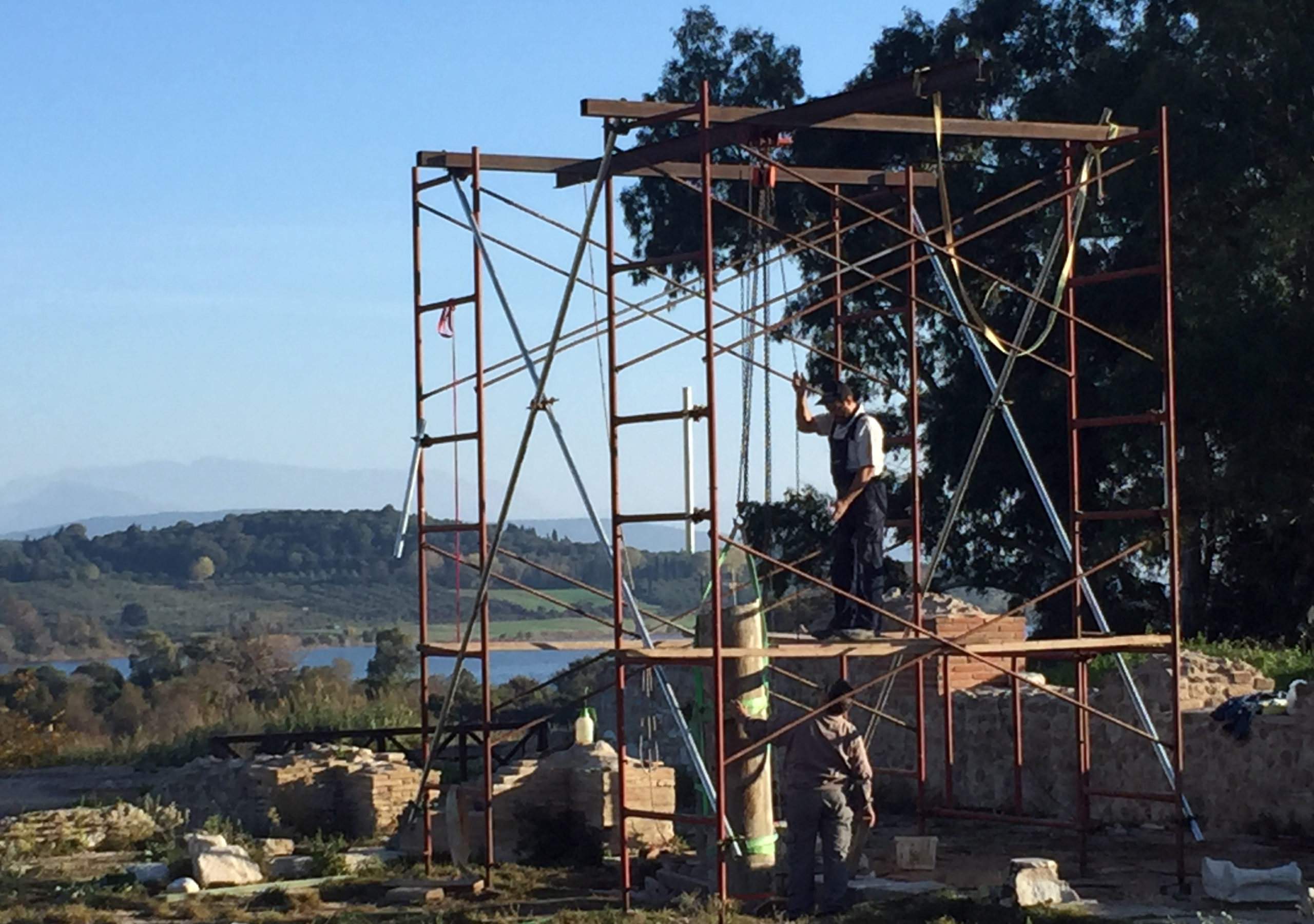 8. Αναστήλωση κιόνων στο περιστύλιο του οίκου του εκδίκου Γεωργίου. Παριστάνεται η τοποθέτηση κίονα στην ανατολική πτέρυγα της στοάς.