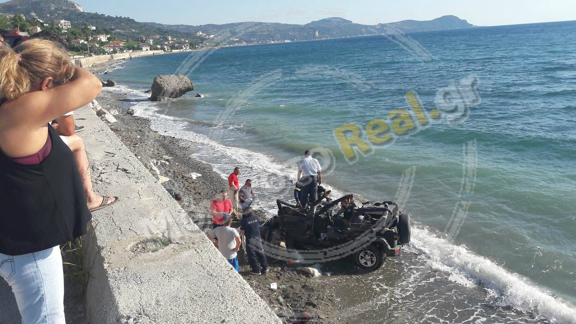 Μάλιστα, πληροφορίες αναφέρουν ότι το τζιπ έκανε τούμπα στον αέρα, χτύπησε βράχο και έπεσε, από ύψος περίπου πέντε μέτρων στην ακτή της θάλασσας.