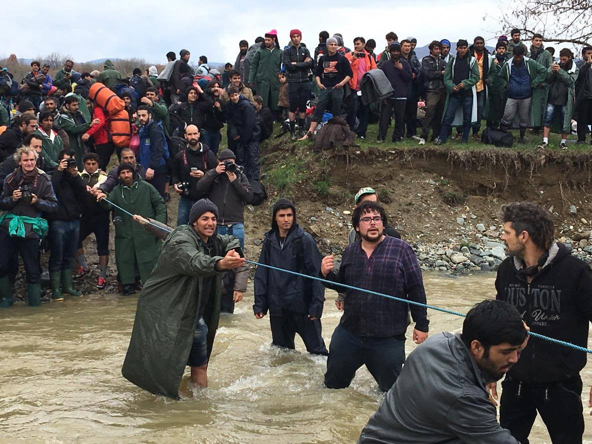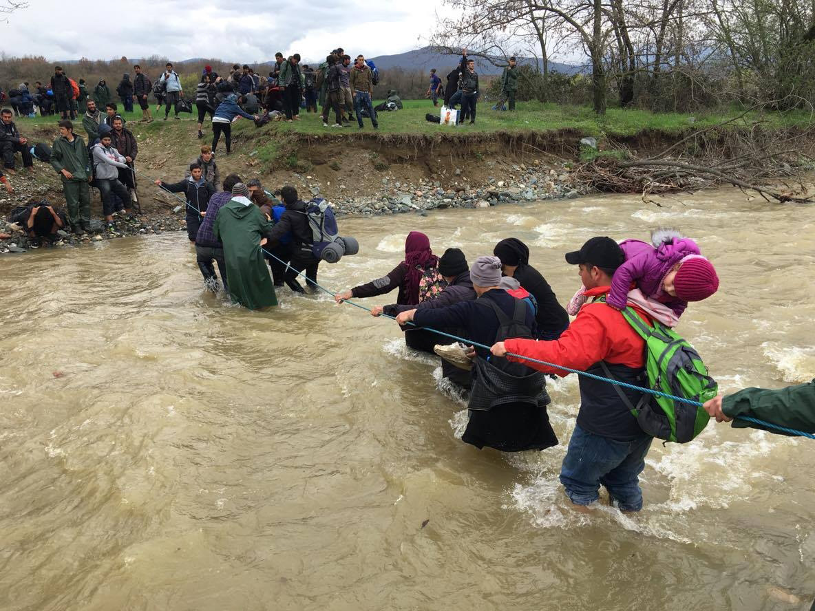 Περίπου 500 πρόσφυγες, αψηφώντας τον κίνδυνο να παρασυρθούν από τα ορμητικά νερά και κρατώντας ένα σχοινί, ο ένας πίσω από τον άλλο, ξεκίνησαν από την Ειδομένη με σκοπό να φτάσουν στα Σκόπια.