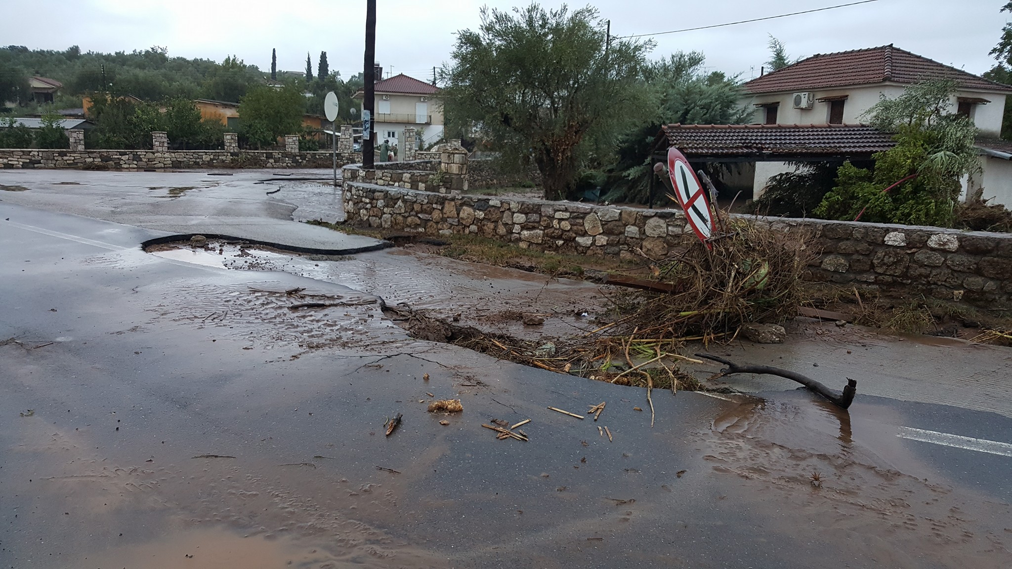 Στο χωριό Εύα, τεράστιες είναι οι υλικές ζημιές, δέντρα και ταμπέλες ξεριζώθηκαν, χωράφια πλημμύρισαν ενώ αυτοκίνητα παρασύρθηκαν από τα ορμητικά νερά.