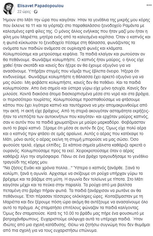 Δεν έχουν τέλος οι συγκλονιστικές μαρτυρίες επιζώντων από τη φονική πυρκαγιά στο Μάτι. Τις δραματικές ώρες που έζησε η ίδια καθώς και πολλά παιδιά, την ώρα που ο οικισμός παραδινόταν στις φλόγες, περιέγραψε μέσα από ένα συγκινητικό κείμενο, το οποίο δημοσίευσε στον προσωπικό της λογαριασμό στο facebook, η συγγραφέας Ελισάβετ Παπαδοπούλου.