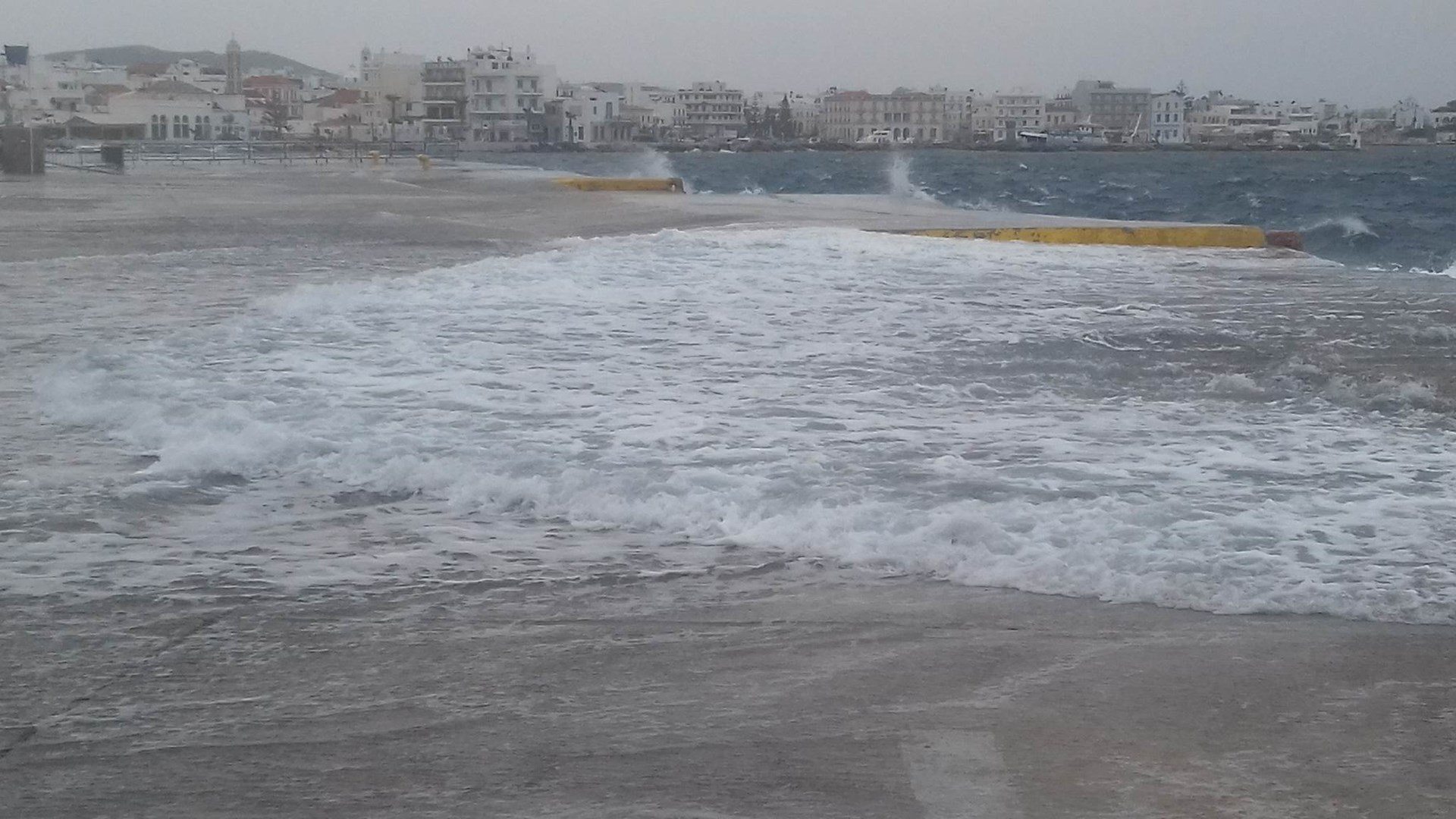 Θάλασσα και προβλήτας έχουν γίνει ένα. Τα μανιασμένα κύματα φτάνουν μέχρι τα αυτοκίνητα που περιμένουν να μπουν στο καράβι. Οι σωστοί χειρισμοί του καπετάνιου και η συντονισμένη προσπάθεια πληρώματος και λιμενεργατών είχαν ως αποτέλεσμα το πλοίο να δέσει τελικά στο λιμάνι της Τήνου.