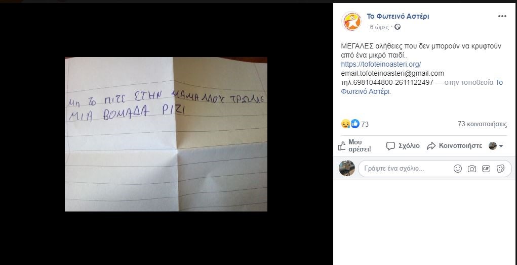 Όπως αποκαλύπτει στο σημείωμα του ο εννιάχρονος, τρώει με την οικογένεια του ρύζι εδώ και μία εβδομάδα, ενώ παράλληλα ζητεί από τους ανθρώπους στο «Φωτεινό αστέρι» να μη μιλήσουν στη μαμά του για το συγκεκριμένο σημείωμα. «Η κατάσταση είναι τραγική. Και μέσα από ένα μικρό παιδί μαθαίνεις την αλήθεια. Το συγκεκριμένο αγοράκι κατά την παραμονή του στο «Φωτεινό αστέρι» κάθισε να ζωγραφίσει για λίγο στα τραπεζάκια που έχουμε στον χώρο μας. Έγραψε αυτό το σημείωμα και μας το έδωσε» αναφέρει η κα. Νικολακοπούλου η οποία τονίζει ότι υπάρχει μεγάλη ανάγκη για τρόφιμα.