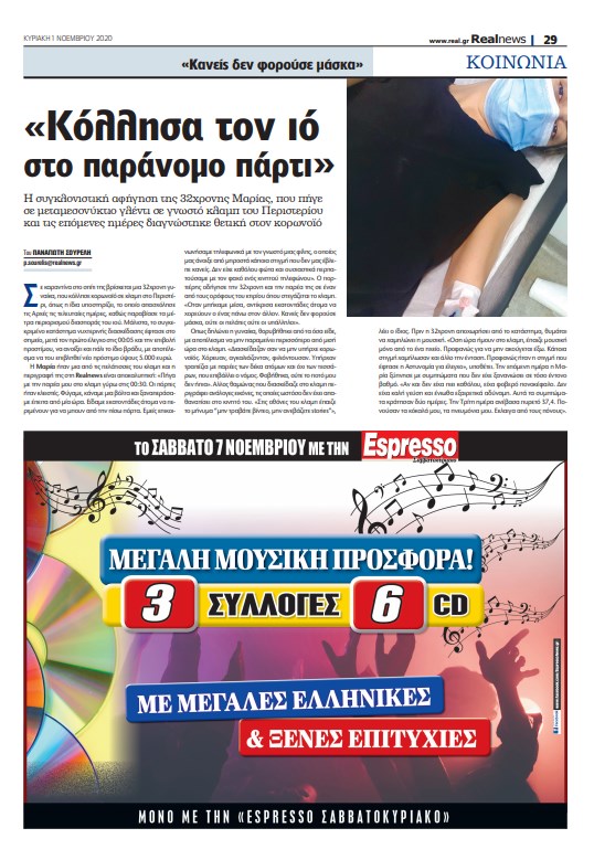 Η Μαρία ήταν μια από τις πελάτισσες του κλαμπ και η περιγραφή της στη Realnews είναι αποκαλυπτική: «Πήγα με την παρέα μου στο κλαμπ γύρω στις 00:30. Οι πόρτες ήταν κλειστές. Φύγαμε, κάναμε μια βόλτα και ξαναπεράσαμε έπειτα από μία ώρα. Είδαμε εκατοντάδες άτομα να περιμένουν για να μπουν από την πίσω πόρτα. Εμείς επικοινωνήσαμε τηλεφωνικά με τον γνωστό μιας φίλης, ο οποίος μας άνοιξε από μπροστά κάποια στιγμή που δεν μας έβλεπε κανείς. Δεν είχε καθόλου φώτα και ουσιαστικά περπατούσαμε με τον φακό ενός κινητού τηλεφώνου». Ο πορτιέρης οδήγησε την 32χρονη και την παρέα της σε έναν από τους ορόφους του κτιρίου όπου στεγάζεται το κλαμπ. «Όταν μπήκαμε μέσα, αντίκρισα εκατοντάδες άτομα να χορεύουν ο ένας πάνω στον άλλον. Κανείς δεν φορούσε μάσκα, ούτε οι πελάτες ούτε οι υπάλληλοι». ‘Οπως δηλώνει η γυναίκα, θορυβήθηκε από τα όσα είδε, με αποτέλεσμα να μην παραμείνει περισσότερο από μισή ώρα στο κλαμπ. «Διασκέδαζαν σαν να μην υπήρχε κορονοϊός. Χόρευαν, αγκαλιάζονταν, φιλιόντουσαν. Υπήρχαν τραπέζια με παρέες των δέκα ατόμων και όχι των τεσσάρων, που επιβάλλει ο νόμος. Φοβήθηκα, ούτε το ποτό μου δεν ήπια». Άλλος θαμώνας που διασκέδαζε στο κλαμπ περιγράφει ανάλογες εικόνες, τις οποίες ωστόσο δεν έχει απαθανατίσει στο κινητό του. «Στις οθόνες του κλαμπ έπαιζε το μήνυμα “μην τραβάτε βίντεο, μην ανεβάζετε stories”» λέει ο ίδιος. Πριν η 32χρονη αποχωρήσει από το κατάστημα, θυμάται να χαμηλώνει η μουσική. «Όση ώρα ήμουν στο κλαμπ, έπαιζε μουσική μόνο από το ένα ηχείο. Προφανώς για να μην ακούγεται έξω. Κάποια στιγμή χαμήλωσαν και άλλο την ένταση. Προφανώς ήταν η στιγμή που έφτασε η Αστυνομία για έλεγχο», υποθέτει. Την επόμενη ημέρα η Μα- ρία ξύπνησε με συμπτώματα που δεν είχε ξανανιώσει σε τόσο έντονο βαθμό. «Αν και δεν είχα πιει καθόλου, είχα φοβερό πονοκέφαλο. Δεν είχα καλή γεύση και ένιωθα εξαιρετικά αδύναμη. Αυτά τα συμπτώματα κράτησαν δύο ημέρες. Την Τρίτη ημέρα ανέβασα πυρετό 37,4. Πο- νούσαν τα κόκαλά μου, τα πνευμόνια μου. Έκλαιγα από τους πόνους».