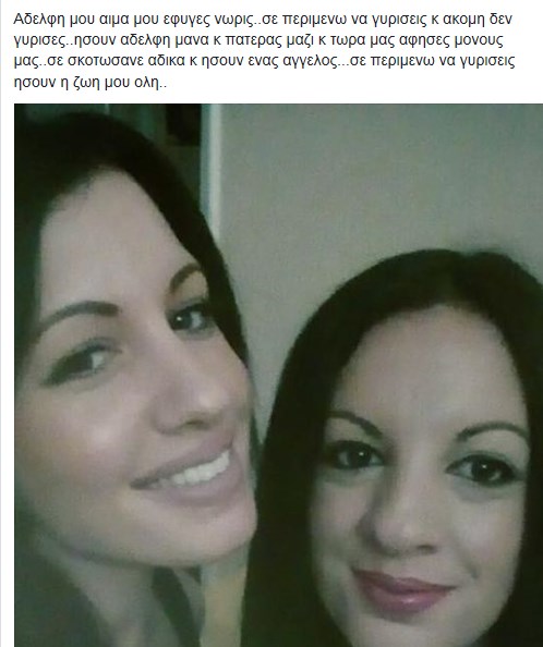Με ένα σπαρακτικό μήνυμα η Κωνσταντίνα αποχαιρέτισε την 33χρονη αδελφή της, Δώρα. «Αδελφή μου, αίμα μου, έφυγες νωρίς. Σε περιμένω να γυρίσεις κι ακόμη δεν γύρισες. Ήσουν αδελφή, μάνα και πατέρας μαζί και τώρα μας άφησες μόνους» γράφει η αδελφή του θύματος και τονίζει στο ίδιο μήνυμά της στο Facebook: