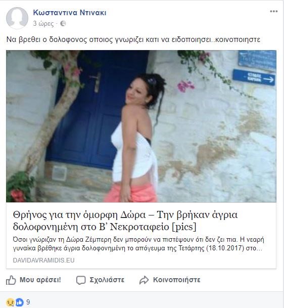 Σε άλλη ανάρτησή της ζητά να βρεθεί ο δολοφόνος που στέρησε τη ζωή της άτυχης Δώρας, η οποία φέρει τραύματα από 14 μαχαιριές, που δέχθηκε κατά την επίσκεψή της σε τάφο φιλικού της προσώπου.