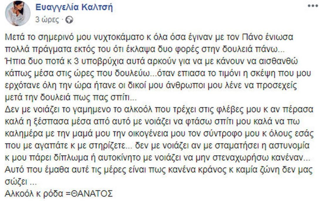“Μετά το σημερινό μου νυχτοκάματο και όλα όσα έγιναν με τον Πάνο ένιωσα πολλά πράγματα εκτός του ότι έκλαψα δύο φορές στη δουλειά πάνω… Ήπια δύο ποτά και τρία υποβρύχια, αυτά αρκούν για να με κάνουν να αισθανθώ κάπως μέσα στις ώρες που δουλεύω… όταν έπιασα το τιμόνι η σκέψη που μου ερχόταν όλη την ώρα ήταν οι δικοί μου άνθρωποι που μου λένε να προσεχείς μετά την δουλειά πως πας σπίτι… Δεν με νοιάζει το γ@@@@@@@ το αλκοόλ που τρέχει στις φλέβες μου και αν πέρασα καλά ή ξέσπασα μέσα από αυτό. Με νοιάζει να φτάσω σπίτι μου καλά, να πω καλημέρα με τη μαμά μου, την οικογένεια μου, τον σύντροφο μου και όλους εσάς που με αγαπάτε και με στηρίζετε… δεν με νοιάζει αν με σταματήσει η αστυνομία και μου πάρει δίπλωμα ή αυτοκίνητο, με νοιάζει να μην στεναχωρήσω κανέναν… Αυτό που έμαθα αυτές τις μέρες είναι πως κανένα κράνος και καμία ζώνη δεν μας σώζει… Αλκοόλ και ρόδα = ΘΑΝΑΤΟΣ» έγραψε η Εύα Καλτσή στον προσωπικό της λογαριασμό.