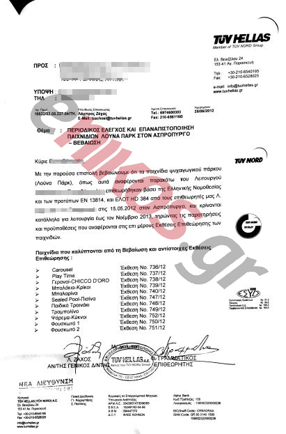 Όπως βλέπετε και στο παρακάτω έγγραφο, τα συγκεκριμένα παιχνίδια του λούνα παρκ φέρονται να είχαν ελεγχθεί το 2012 από ιδιωτική εταιρεία σε αποθήκη στον Ασπρόπυργο. Η πιστοποίηση των παιχνιδιών έληξε το Νοέμβριο του 2013.