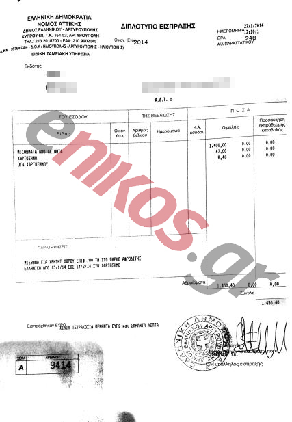 Στο παρακάτω έγγραφο βλέπετε το διπλότυπο είσπραξης του ενοικίου ύψους 1.450 ευρώ, που εισέπραττε ο Δήμος Ελληνικού για την έκταση που είχε παραχωρήσει στο λούνα παρκ. Το διπλότυπο έχει ημερομηνία 27 Ιανουαρίου 2014.