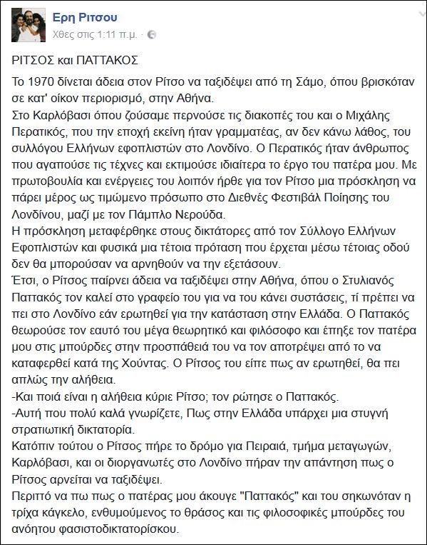 Ολόκληρη η ανάρτηση της Έρης Ρίτσου: