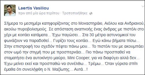 «Σήμερα το μεσημέρι κατηφορίζοντας στο Μοναστηράκι, Αιόλου και Ανδριανού, ακούω πυροβολισμούς. Σε απόσταση αναπνοής ένας άνδρας με πιστόλι στο χέρι με κοιτάει κατάματα… Έχω παγώσει… Στα 30 μέτρα αστυνομικοί του φωνάζουν να παραδοθεί… Γυρίζει τους κοιτάει… Εγώ κάνω βήματα πίσω… Στην επιστροφή του σχεδόν πέφτει πάνω μου… Το πιστόλι του με ακουμπάει στον ωμό την στιγμή που με προσπερνάει… Πιο πάνω προσπαθεί να σταματήσει ένα αυτοκίνητο μαύρο, Mini Cooper, για να διαφύγει αλλά δεν… Έχω μείνει εκεί και προσπαθώ να συνέλθω… Τρέμω… Όταν γύρισα σπίτι έμαθα ότι συνελήφθη ο Ν. Μαζίωτης… Αυτά…!».