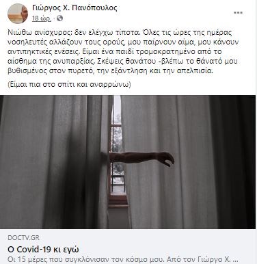 “Μία εβδομάδα προσπαθούσα να αντιμετωπίσω τον covid στο σπίτι. Φοβούμουν το νοσοκομείο. Φρίκαρα στην ιδέα ότι μπορεί να βρεθώ σε ένα νοσοκομείο γεμάτο με ασθενείς, σε συνθήκες που τα μίντια περιέγραφαν ως Αποκάλυψη ενώ οι κρατικές προειδοποιήσεις τόνιζαν: Μην Πάτε σε Νοσοκομεία. Η καθυστέρηση ήταν καταστροφική. Την Τετάρτη το απόγευμα μεταφέρομαι με ασθενοφόρο στον Ευαγγελισμό με οξεία πνευμονία.