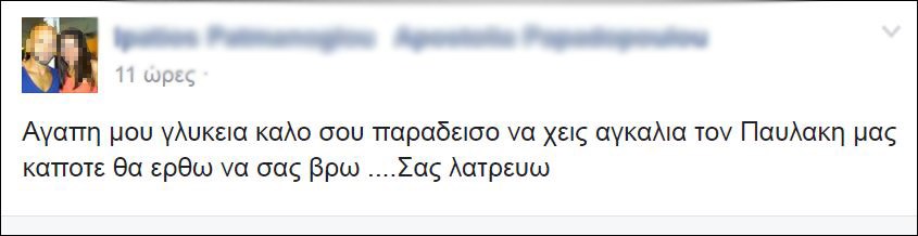 «Αγάπη μου γλυκεία καλό σου παράδεισο να έχεις αγκαλιά τον Παυλάκη μας κάποτε θα έρθω να σας βρω… Σας λατρεύω», έγραψε χαρακτηριστικά.